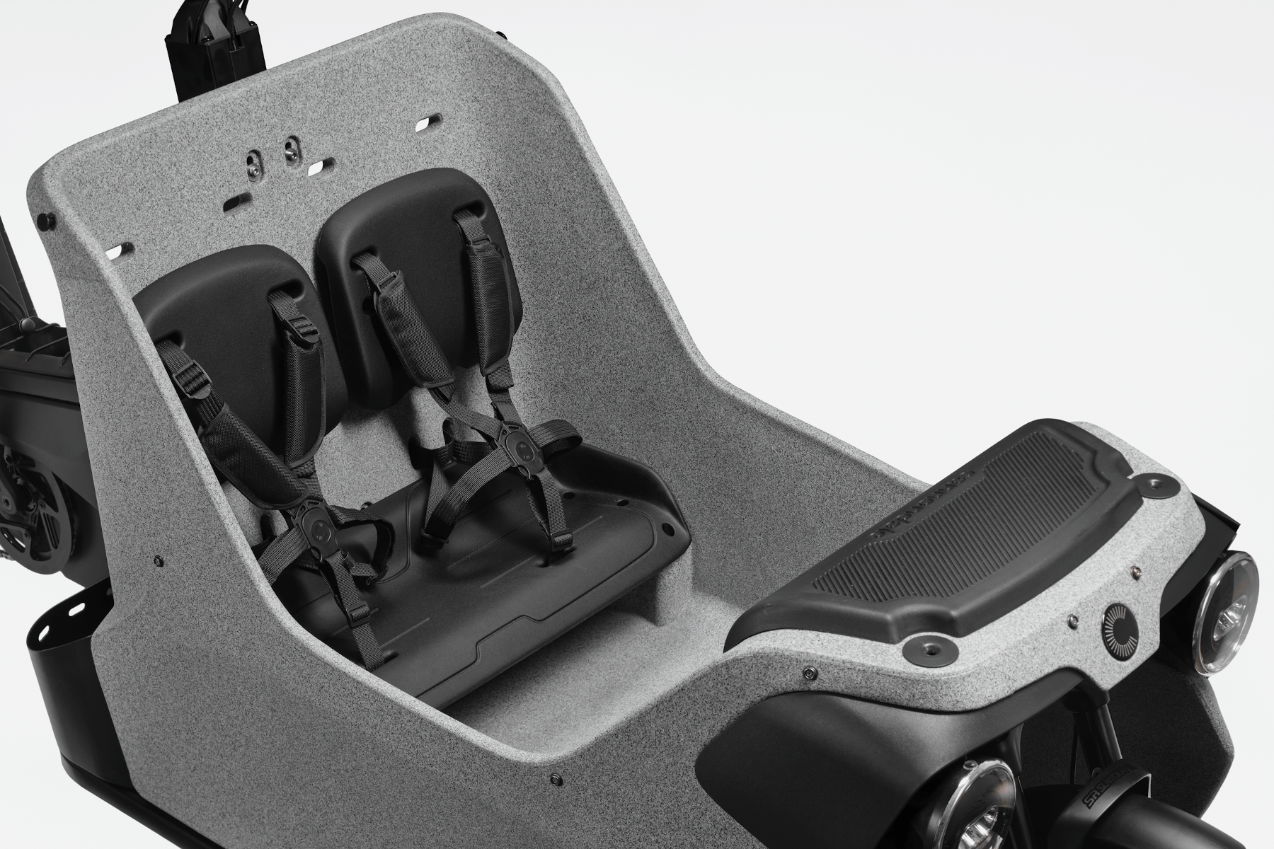 Le porte-bagage arrière supporte jusqu’à 80 kg, et la cabine avant jusqu’à 100 kg. De quoi transporter deux enfants + des sacs sans aucun souci.