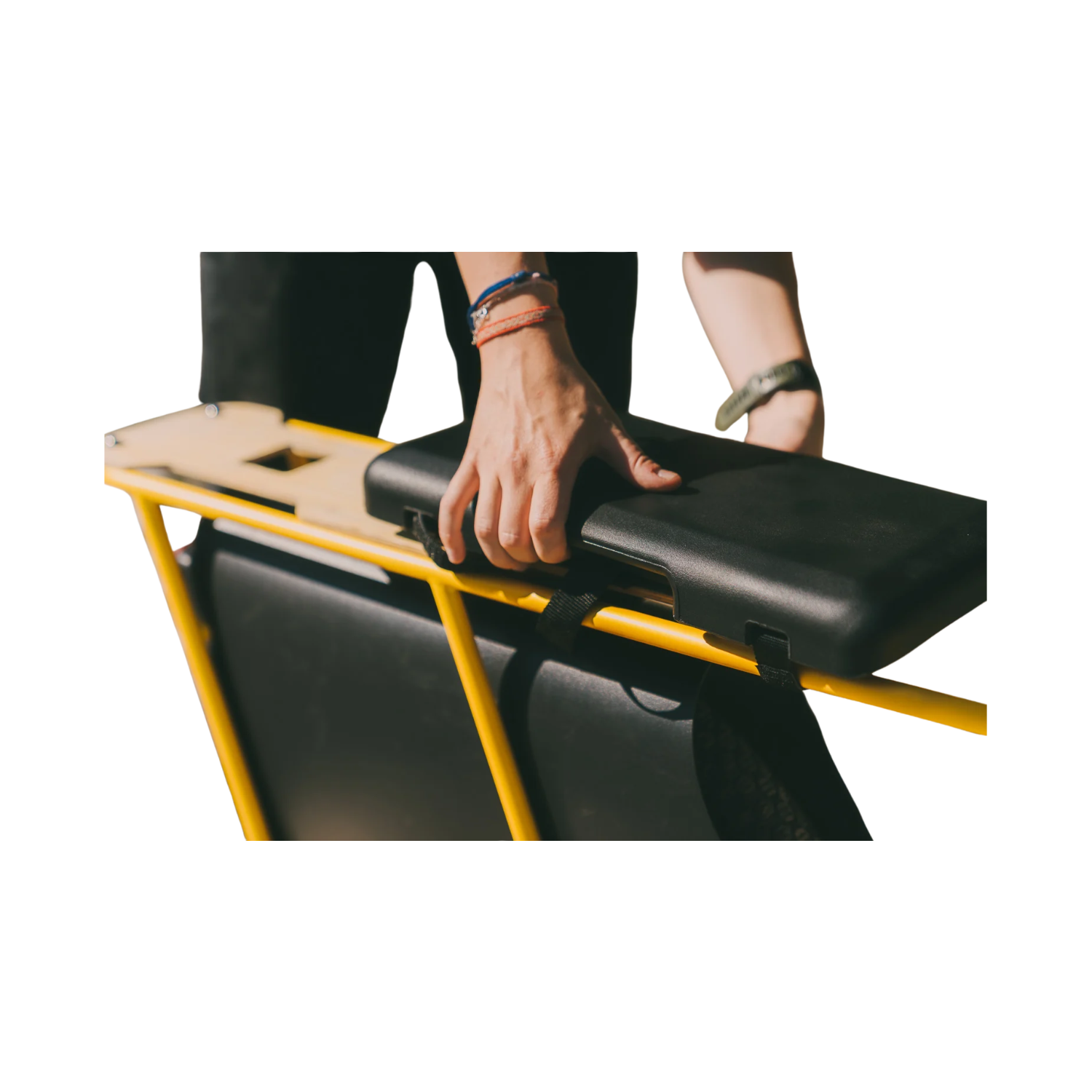 Facile à installer, il se fixe directement au porte-bagages arrière grâce à des sangles solides en Velcro. Compact et pratique, il s’adapte parfaitement aux vélos longtails de la marque Yuba (Spicy Curry, Mundo, Kombi, etc.).