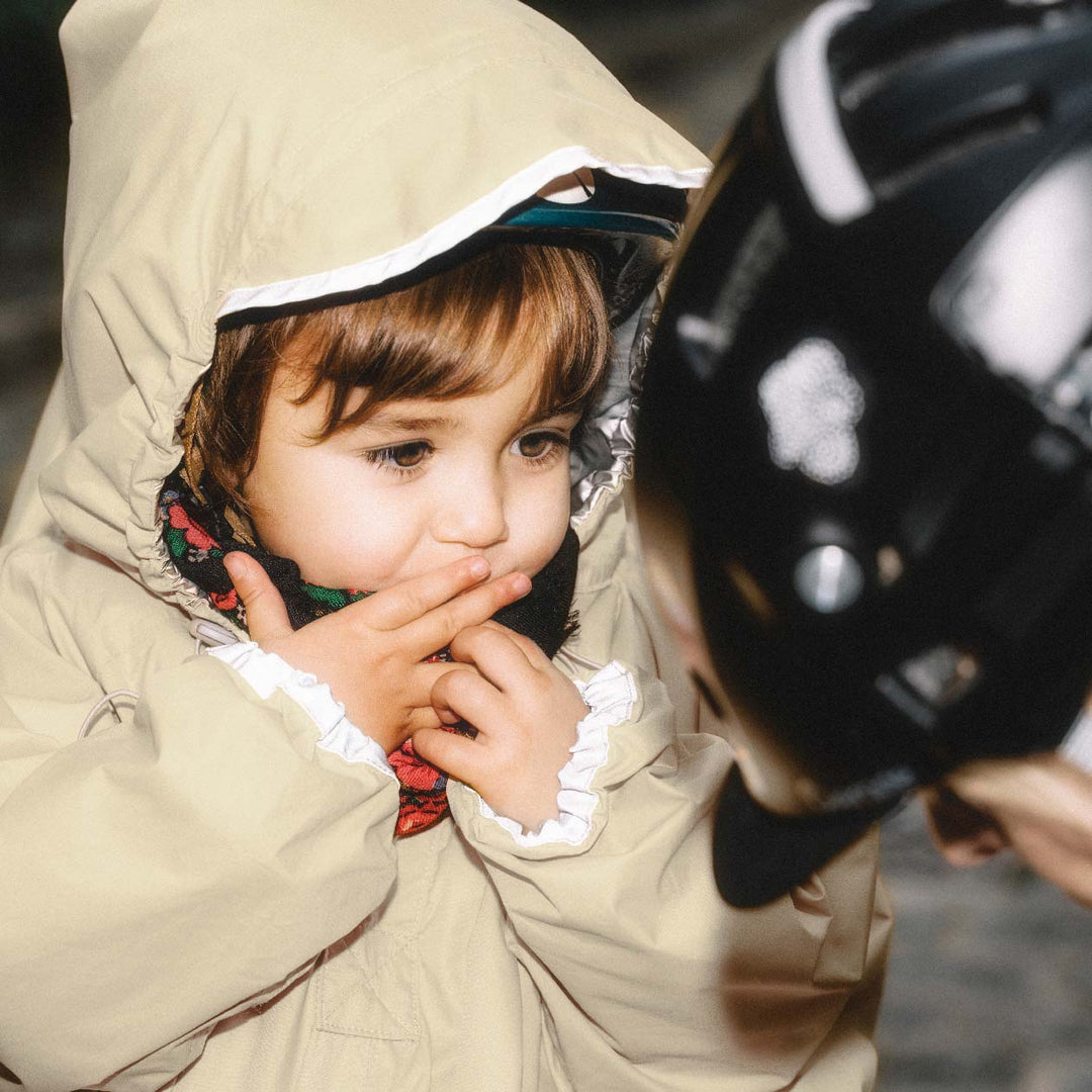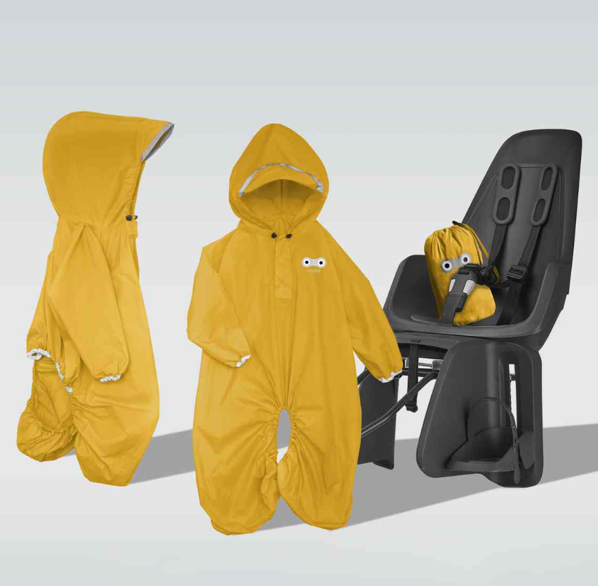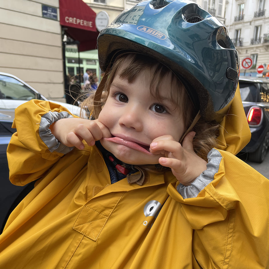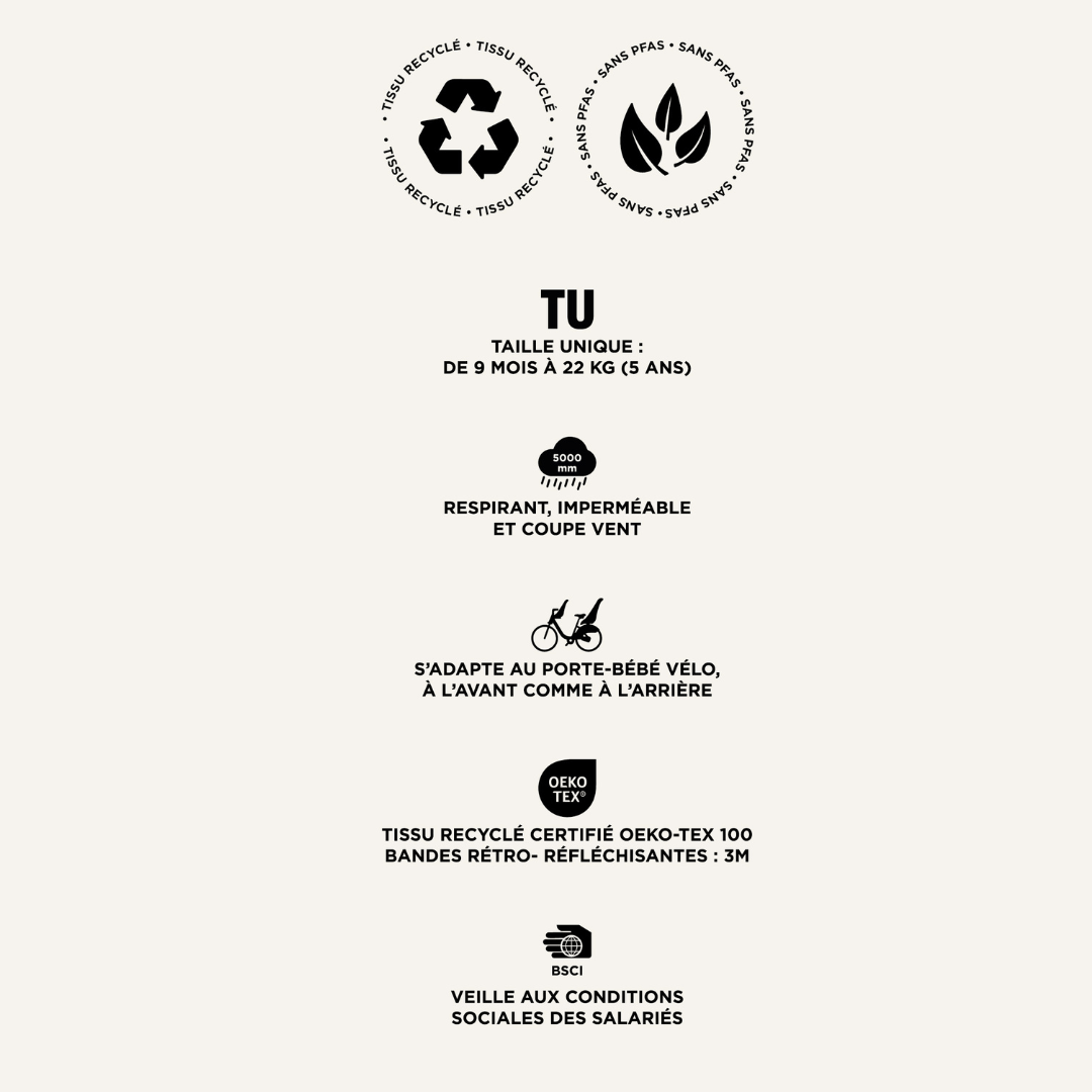 La capuche extra-large est compatible avec la majorité des casques de vélo. Sa coupe ample couvre facilement un sac à dos, des sacoches ou un porte-bébé.