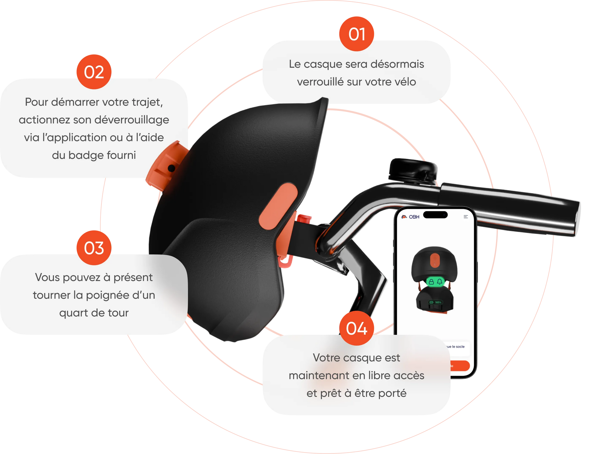 OBH (On Board Helmet), start‑up lyonnaise fondée en 2021, a pour mission de rendre le port du casque plus facile grâce à un casque embarqué toujours sur le vélo ou trottinette, recyclable, durable et connecté