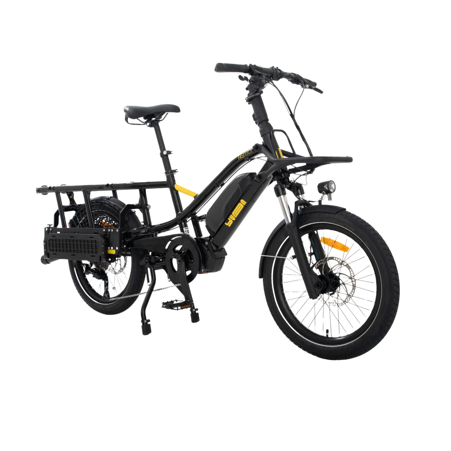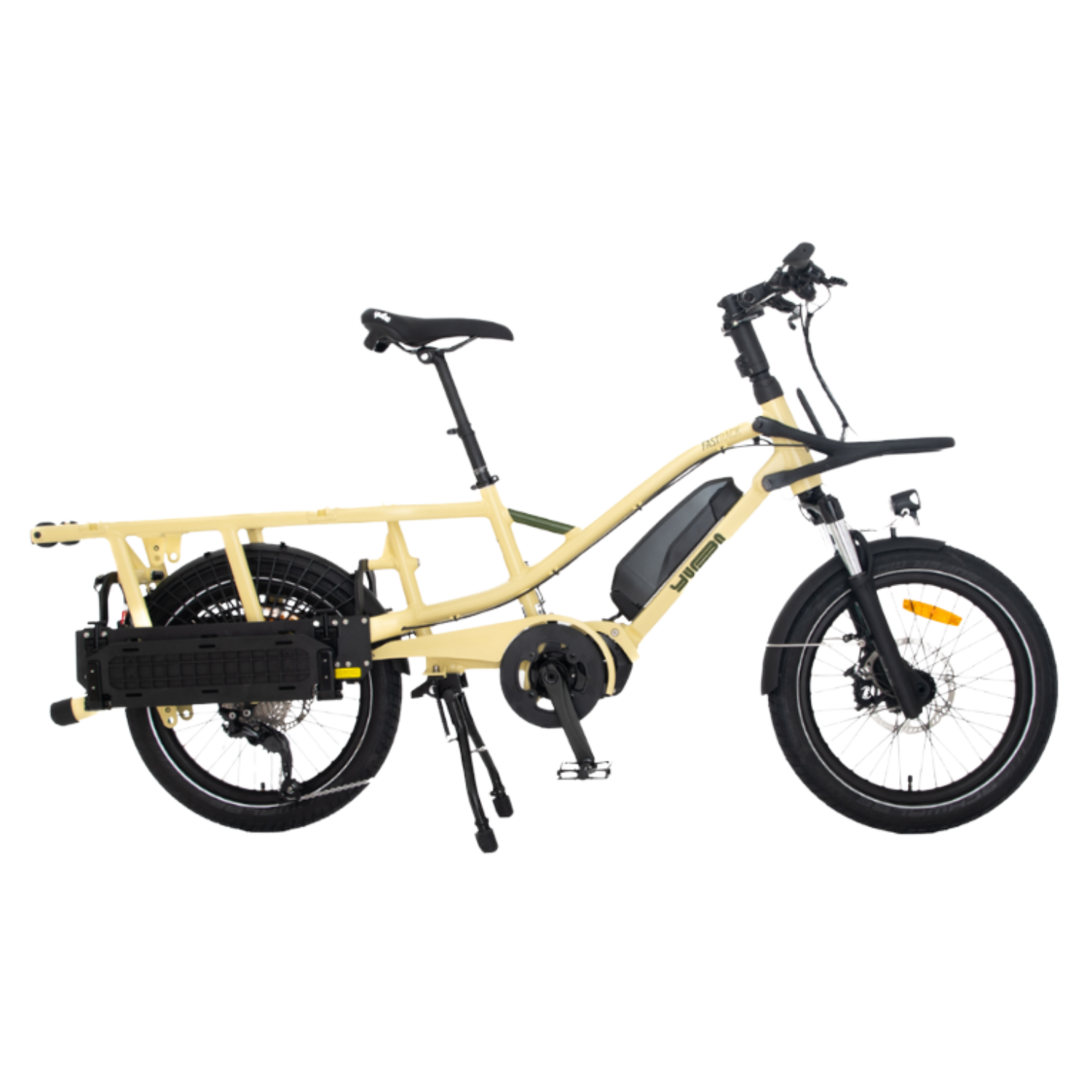 Le Yuba Fastrack peut supporter jusquâĂ 200 kg au total, pilote compris, avec une charge utile arriĂšre allant jusquâĂ 80 kg. De quoi transporter enfants + bagages sans compromis.